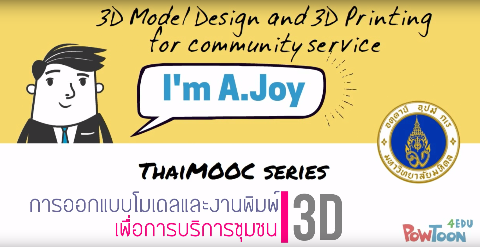 เป็นรายวิชาสำหรับผู้สนใจทั่วไปและนักศึกษา หลักการและทฤษฎีด้านการออกแบบ การเข้าใจมุมมอง 3 มิติ หลักการเขียนแบบ 3 มิติ โปรแกรมคอมพิวเตอร์ที่เกี่ยวข้องกับงานออกแบบโมเดล 3 มิติเพื่อสร้างชิ้นงาน โปรแกรมที่เป็น Freeware , License และความแตกต่างของความสามารถของโปรแกรมนั้นๆ หลักการและทฤษฎีด้านวัสดุสำหรับการพิมพ์ 3มิติ เส้น Filament ชนิดต่างและคุณสมบัติ ลำดับการออกแบบด้วยโปรแกรม ขั้นตอนการขึ้นรูปด้วยเทคนิคต่างๆ การใช้อุปกรณ์เครื่องมือวัดต่างๆ เช่น เวอร์เนีย เป็นต้น แนวคิดเกี่ยวกับการออกแบบชิ้นงานและตัวอย่างงานที่ไม่สามารถหาได้ในท้องตลาด หลักการออกแบบเกี่ยวกับทางกล การทดแรง การใช้เฟือง การออกแบบเฟืองทดแรงต่างๆ ข้อต่อ ข้อพับ สลัก โปรแกรมวิเคราะห์ความแข็งแรงของชิ้นงาน เทคนิคการพิมพ์โมเดล 3 มิติ การจัดวางชิ้นงานก่อนพิมพ์เพื่อให้ผลพิมพ์ออกมาดีที่สุด