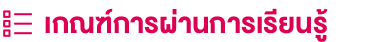 - ผู้เรียนมีคะแนนรวมทั้งหมดไม่ต่ำกว่า 70% ถือว่าผ่านเกณฑ์เพื่อรับประกาศนียบัตรในระบบได้